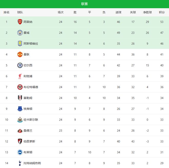 随着曼联32+曼城22爆冷!英超最新积分榜:维拉丢分红魔回前四